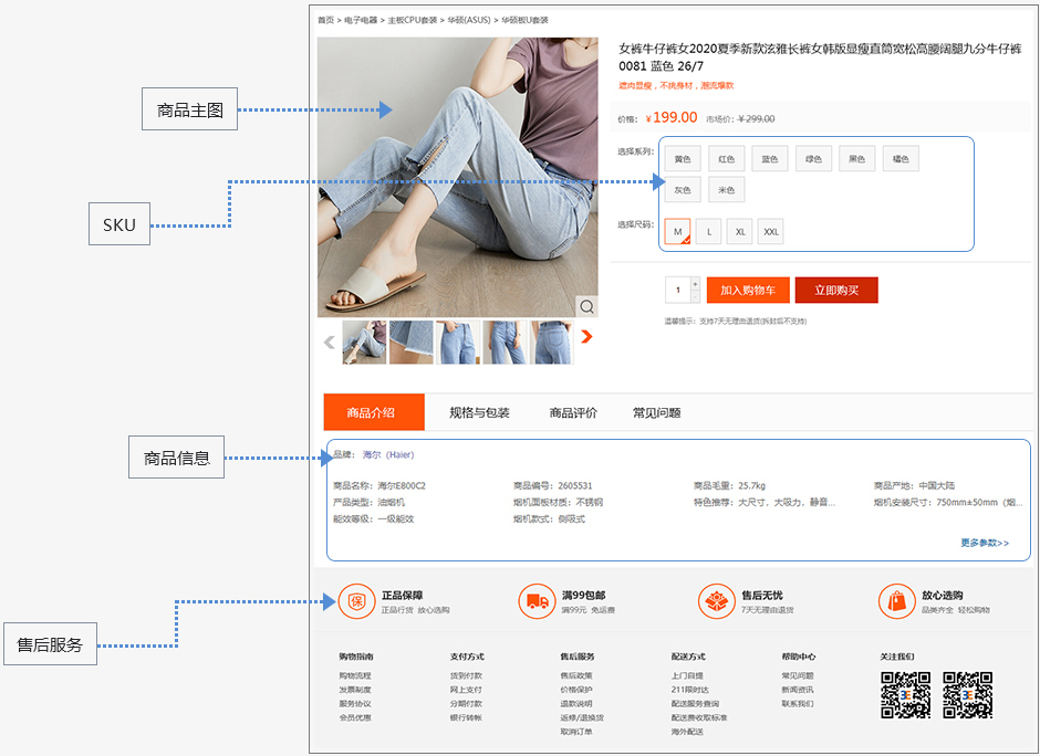 主图、产品图、产品属性(价格、库存、颜色、尺寸)、商品描述、细节展示、客户评论、买家回答、售后服务一应俱全